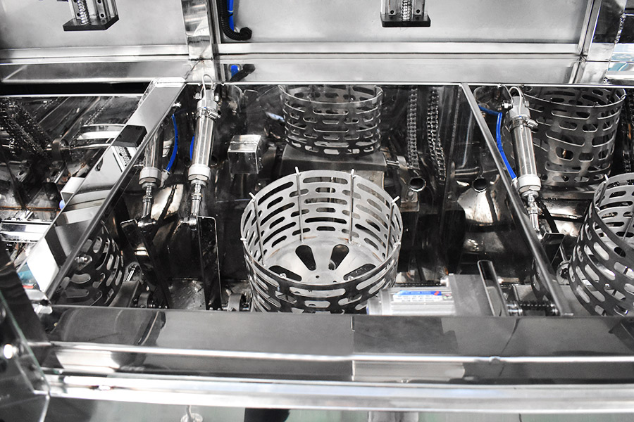 該設(shè)備有自動(dòng)上下料及轉(zhuǎn)角系統(tǒng)、超聲波清洗系統(tǒng),自動(dòng)拋動(dòng)、自動(dòng)溢流和油污分離裝置,噴淋系統(tǒng)、自動(dòng)高壓切水系統(tǒng)、自動(dòng)烘干系統(tǒng)。機(jī)械手自動(dòng)輸送系統(tǒng)采用高精度直線(xiàn)導(dǎo)軌配合高精度位置檢測(cè)傳感器,機(jī)械手可以準(zhǔn)確的實(shí)現(xiàn)工件的抓取和放置。自動(dòng)進(jìn)排液和自動(dòng)加溫系統(tǒng)完全實(shí)現(xiàn)了無(wú)人干預(yù),自動(dòng)運(yùn)行,很大程度上降低了工人的勞動(dòng)強(qiáng)度。先進(jìn)的霧氣處理系統(tǒng)可以將清洗時(shí)產(chǎn)生的霧氣冷凝回流,空氣經(jīng)過(guò)濾和活性炭吸附后排出。